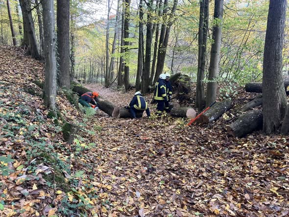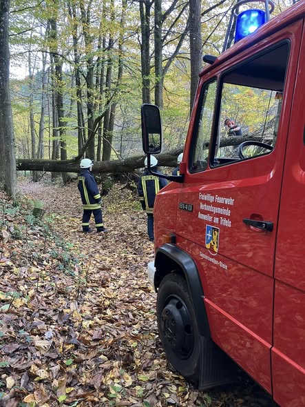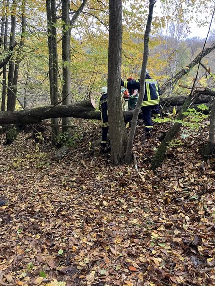 Zum Glück kam der Besitzer der Rinder aus der anderen Fahrtrichtung dazu, so dass unser Einsatzleiter zur Lageerkundung mit diesem vorfahren konnte, während der Rest der Mannschaft mit der Motorsäge den Baum zerlegt und so die Durchfahrt für unser Einsatzfahrzeug wieder frei gemacht hat.